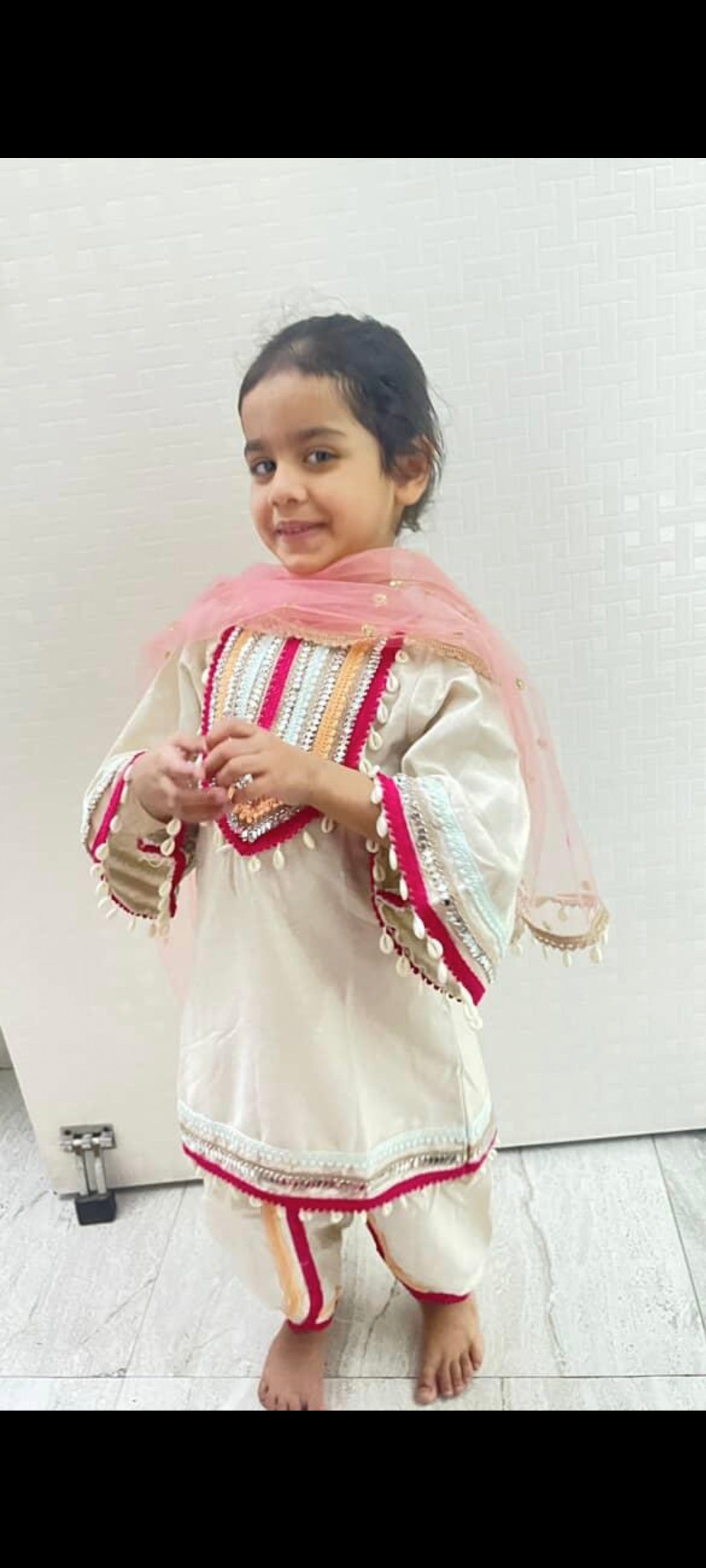 organic cotton kurta set emblished with lace and kaudi work along with tulip and net dupatta with shells