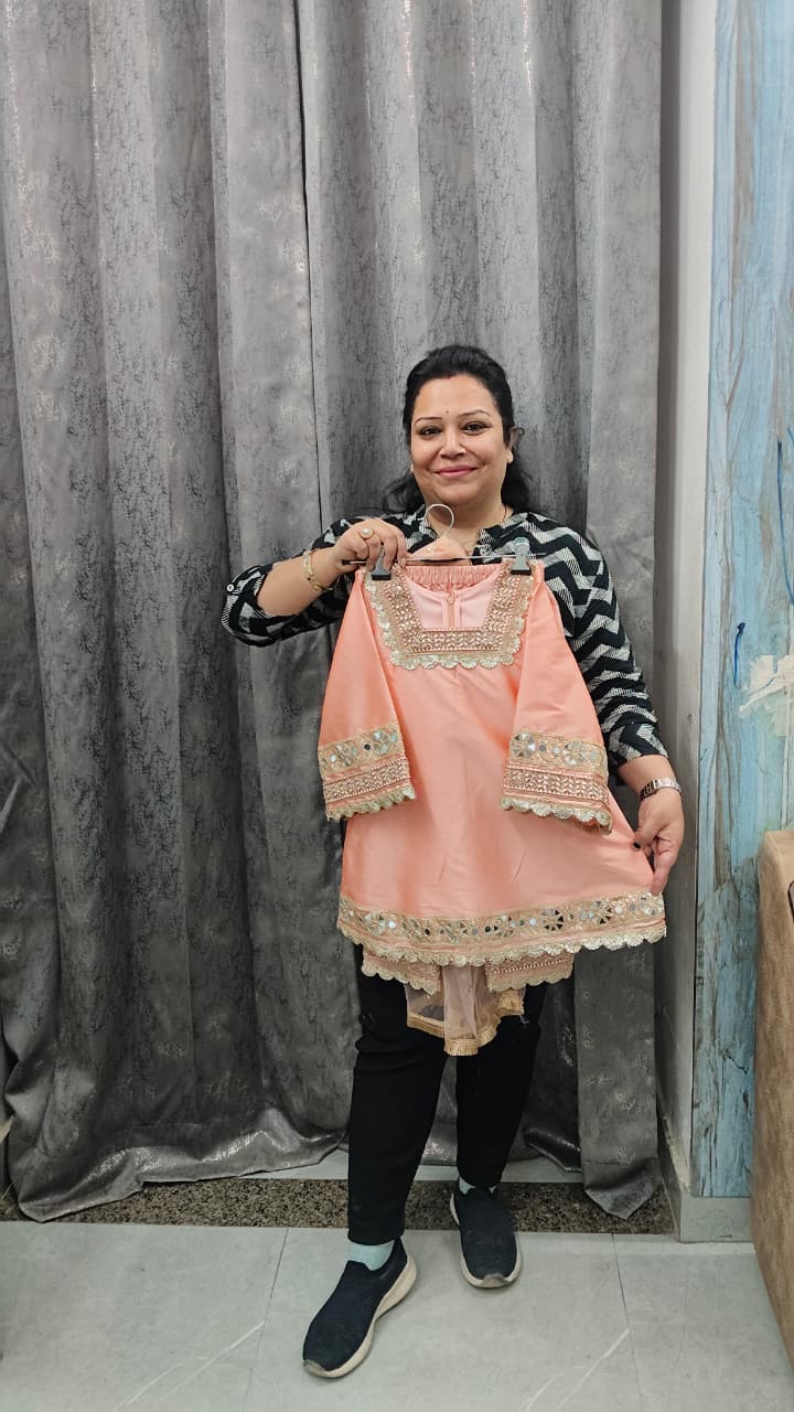 - Work: Detailed mirror work with elegant neckline embroidery.