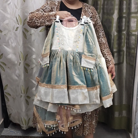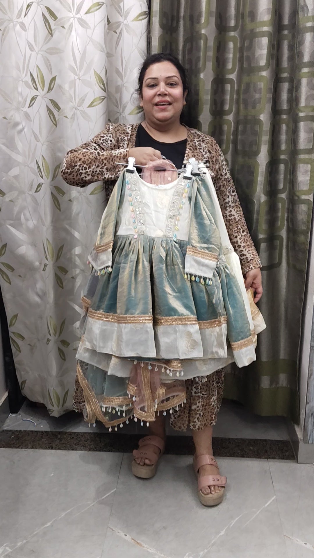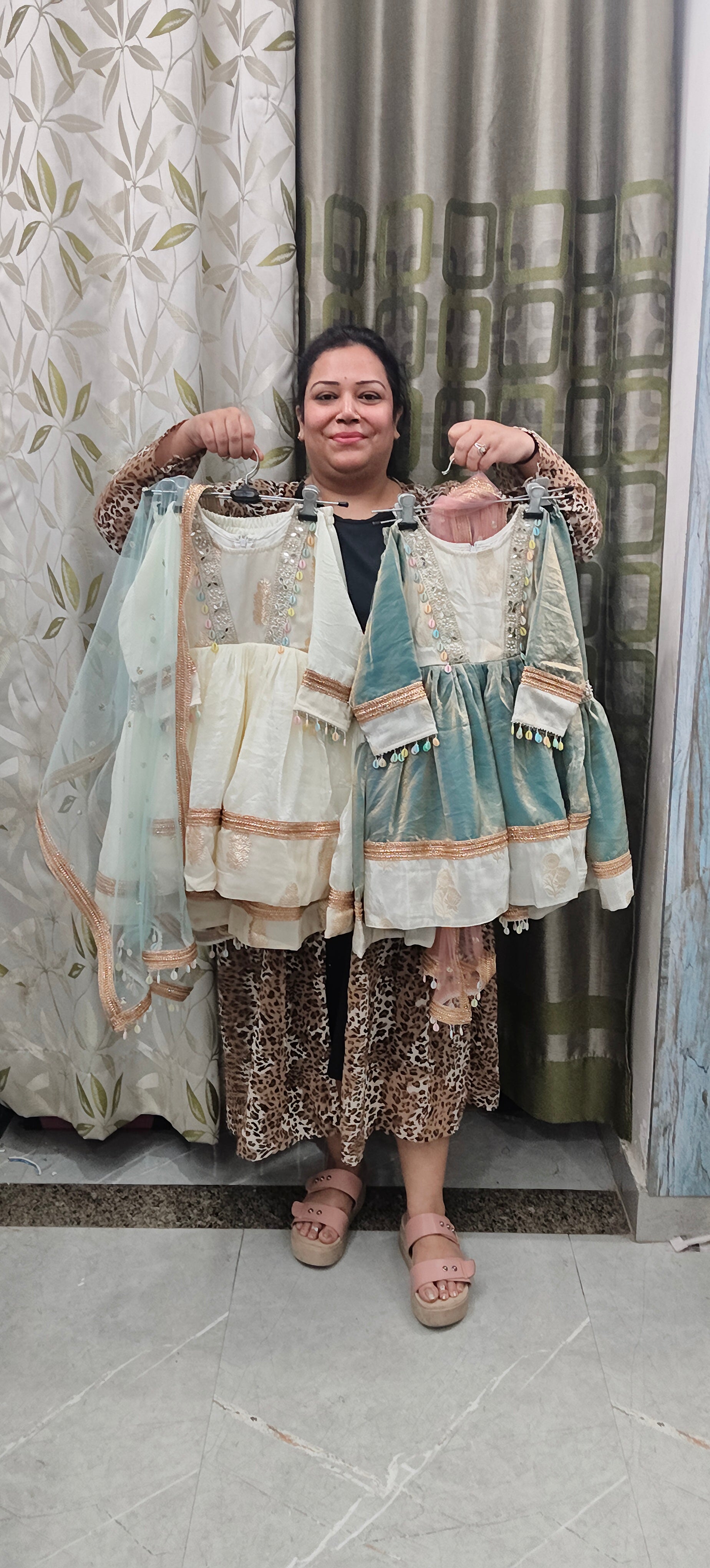 Premium satin shimor frock suits with garara emblished with beautiful handwork lace n styled with pure cosmos silk zari borders n yoke along with net dupataa