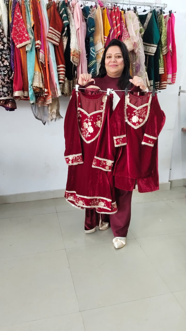 Luxury micro velvet Premium 3 pcs suits along with handwork and mirror detailing.