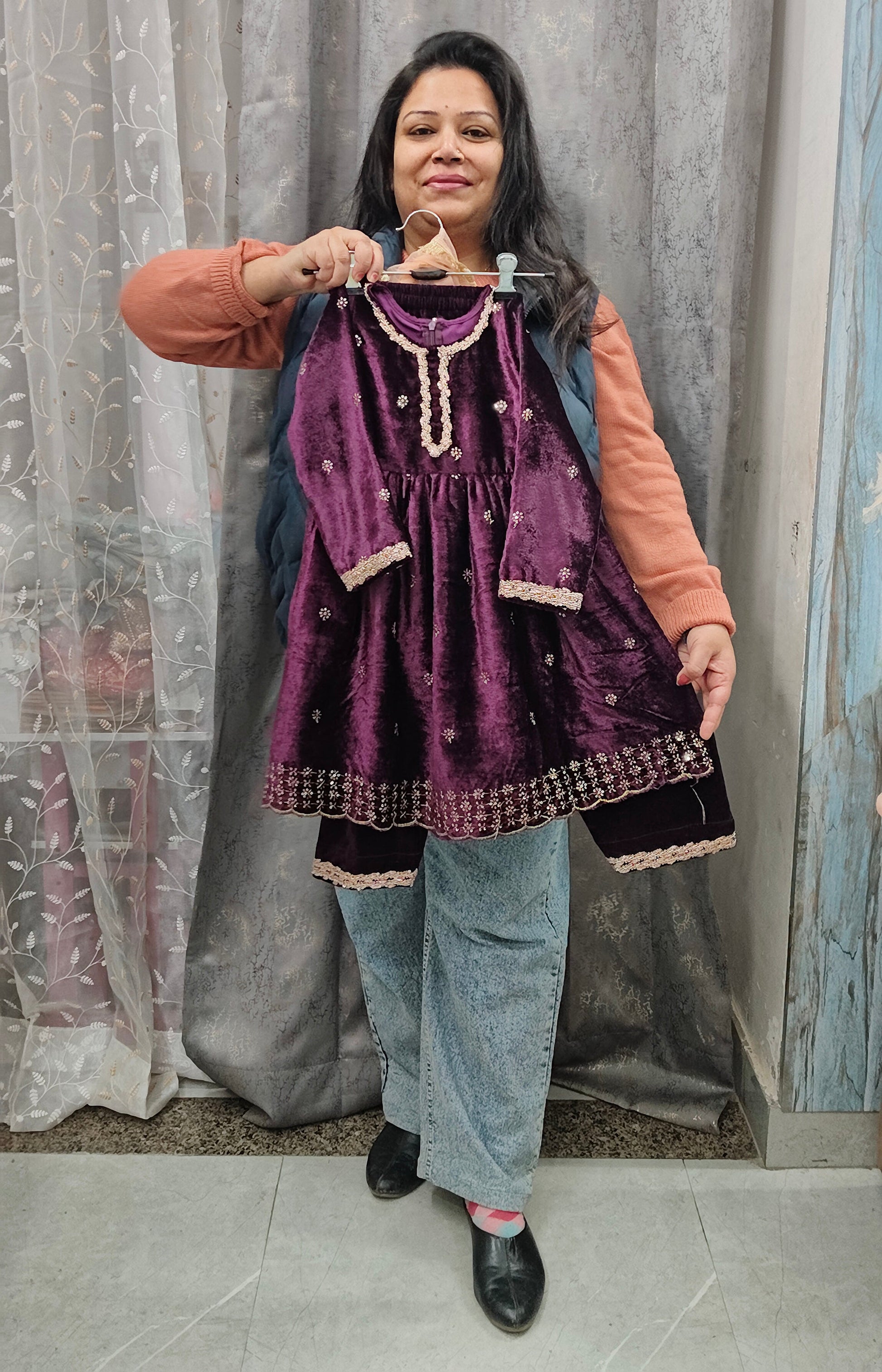 Beautifully designed premium velevt heavy embroidered kurta with cut work borders and salwar along with contrast sequis work duptta