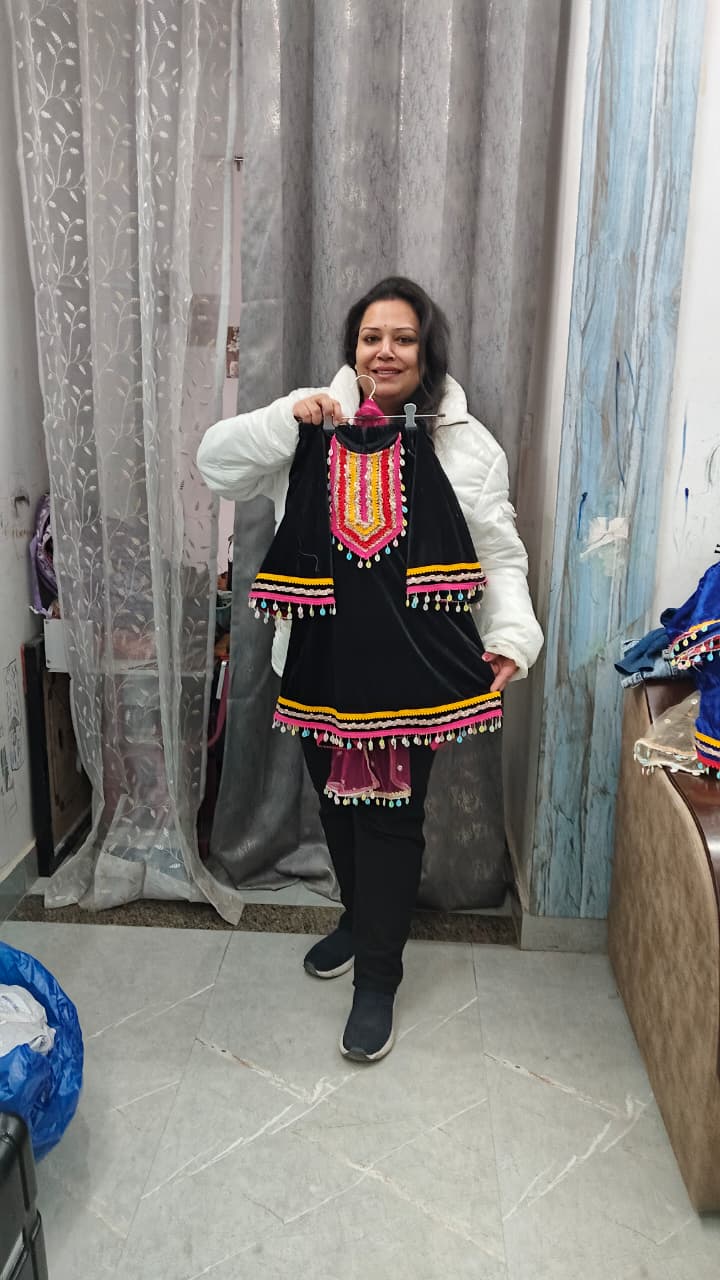 Premium velvet A-line dress with heavy neck and bell sleeves, embellished with beautiful kaudi and mirror lace.